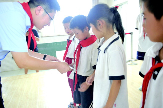 在国庄小学,济南轨道交通集团的工作人员为困难学生发善款。