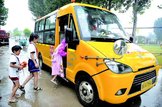 6月28日,国庄小学放学后,孩子们排队走上校车。