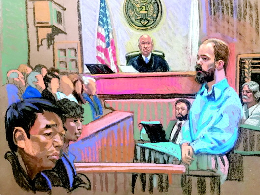这是6月24日法庭素描,布伦特·克里斯滕森(前右)出庭受审,为避免妨碍司法公正,陪审团员的面部被有意模糊化了。 新华社发