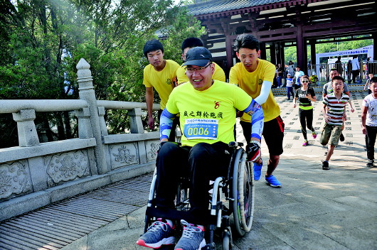 作为参加本次赛事的唯一一名残疾人,蔡起蛟耗时1小时44分,用自己顽强的精神诠释了马拉松精神。