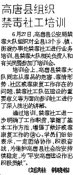 6月27日,高唐县公安局禁毒大队组织对全县13个乡、镇、街道办事处禁毒社工进行业务培训,县禁毒大队相关负责人和有关民警参加了培训会。