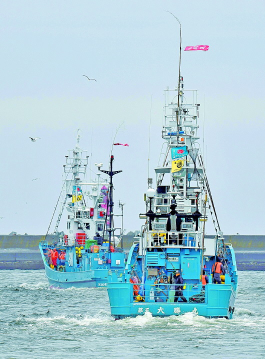 7月1日,在日本北海道钏路一港口,捕鲸船出海捕鲸。 新华/法新