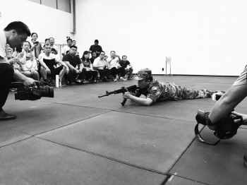 基地官兵演示持枪射击动作要领。