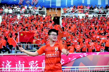 本报7月1日讯(见习记者 张艺馨) 6月30日是中超第15轮—山东鲁能主场迎战北京国安的比赛,赛前,《我和我的祖国》歌声在赛场响起,全场3.8万名球迷不约而同地起立齐声歌唱,激动地挥舞着一面面小国旗和球队助阵条幅,看台成了一片红色的海洋。领唱歌手中两位是日照人哦。