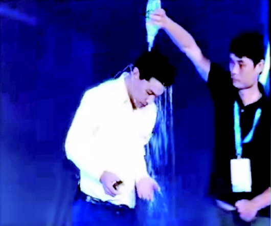 在演讲开始10分钟左右,有一名男子走上台,对着正在演讲的李彦宏的头部泼水。由于事发突然,现场观众惊愕,随即现场保安控制了该男子。