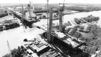 作为控制性工程的京杭运河主航道桥,采用双塔斜拉桥结构,跨径布置95+210+95米,关键线路京杭运河主航道桥采用H形双塔斜拉桥结构,跨径布置95+210+95米。主塔外观采用荷花形状,无缝融入南四湖湖区整体景观,与运河文化交相辉映。四根主塔设计完成64节,主梁采用挂篮现浇,中跨29个梁段,现已完成18个,预计11月15日全部完成。