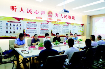 周村区的市区镇三级人大代表在旱码头物流产业园民情联络站与义务咨询员一起接待群众。