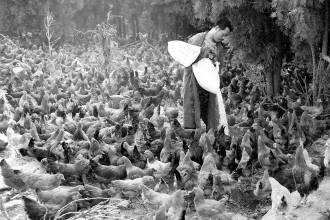 7月3日,枣庄市市中区齐村镇凤凰村农民王广成在给散养的土鸡喂食。王广成和妻子滕茂秀都是残疾人,通过在山林里散养“生态鸡”脱贫走上致富路。