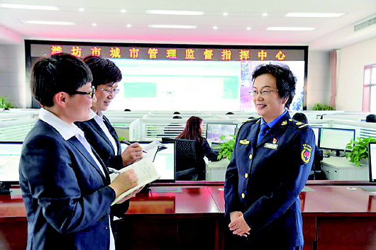 张桂凤(右一)是潍坊市城市管理行政执法支队支队长、潍坊市城市管理监督指挥中心主任。工作38年来获得了山东省“三八红旗手”“山东省先进工作者”“齐鲁巾帼十杰”等称号。她所率领的团队被授予全国“青年文明号”等70多项荣誉。