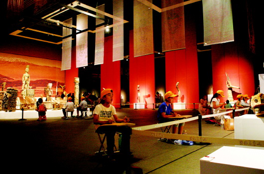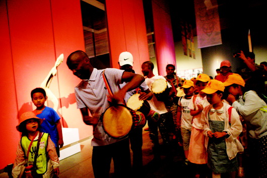 为了营造良好地观展体验,拉近展品与观众之间的距离,使观众更好地领略非洲文化艺术风情,山东美术馆围绕此次雕刻展从平面到立体对展馆进行了精心布置安排:展馆天顶有序悬挂了众多非洲艺术纹饰元素的彩色纱幔,与立置于地面展台的雕刻作品彼此两相呼应,气氛十足。同时,展馆中央还设立了大型非洲风景背景板,有序摆放的大量雕刻作品与非洲景色融为一体,使参观者在展馆内也能感受到原汁原味的非洲风情。展览还配套设置了影像放映角,观众在参观过程中不但实现了良好的代入感,而且能够从思想层面更加直观和深入的认识非洲雕刻艺术的内涵与特点。此外,记者还发现现场有多位小观众还兴奋地击打着展厅内多架非洲手鼓,自由、质朴的自然之声在展厅回荡,更让观众在视觉感官等多方面获得了美感与愉悦,从而实现了由内而外的互动观展体验。