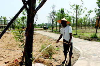 一路走来,记者看到,占地50.80亩的果蔬种植区已经种满了诸如辣椒、茄子、土豆等经济类农作物,道路两边栽种的向日葵花竞相开放,而北侧的百果园内也已种满了包括樱桃、草莓、香梨、油桃等多类水果。工人们或在田垄上逐个为茄果类植物制作插架,或为园区刚刚栽种不久的树木浇水,现场一派繁忙的场景。