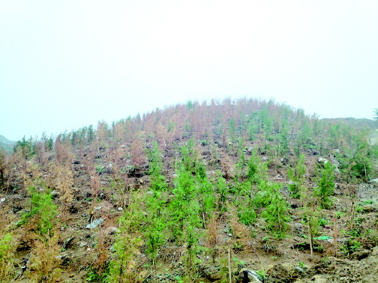 渣土山上今年新栽的绿化树枯死了很多。