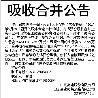 经山东高速股份有限公司(以下简称“高速股份”)2019年6月30日召开的股东大会审议通过,高速股份吸收合并全资子公司山东高速潍莱公路有限公司(以下简称“潍莱公司”),高速股份存续,潍莱公司注销。合并前高速股份的注册资本481116.5857万元;潍莱公司的注册资本10000万元;合并后存续的高速股份注册资本481116.5857万元。根据《公司法》和相关法律法规的规定,合并前各方的债权债务均由合并后存续的高速股份承继,债权人自接到通知书之日起三十日内,未接到通知书的自本次公告之日起四十五日内,可以要求公司清偿债务或者提供相应的担保。