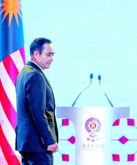 6月23日,在泰国曼谷,巴育准备在第34届东盟峰会上讲话。 新华/美联