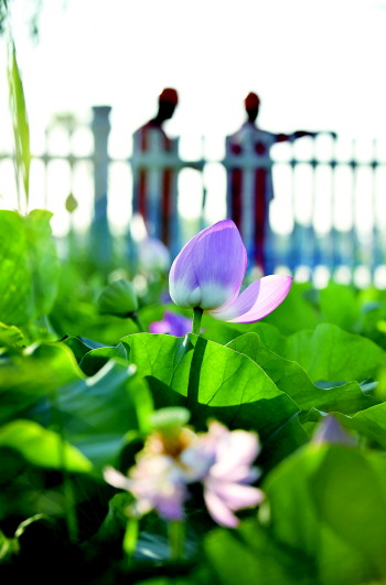 景色宜人、游人如织的风景区内,小桥流水,曲廊回转,碧叶连波,清香沁人。绿叶繁花的环绕中,清洁整齐的井场,傲然耸立的抽油机,穿梭忙碌的红色身影,则成为景区另一道亮丽的风景。