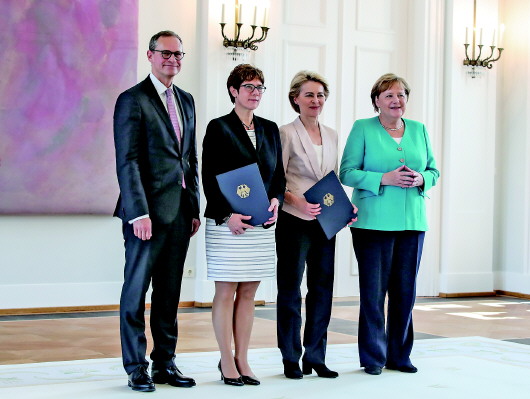 17日,在德国柏林总统府,(从右至左)德国总理默克尔、冯德莱恩和克兰普-卡伦鲍尔在仪式后合影。 新华社发