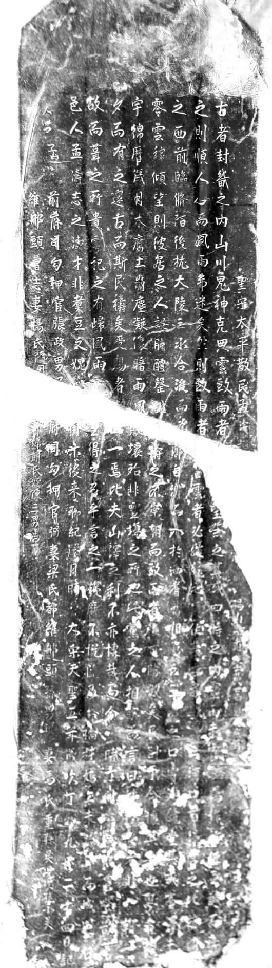 1989年10月,全省文物普查开始,普查组在微山县付村乡三河口村已干涸的薛河河底,发现躺着一块残碑。我当时是普查组的成员,跑近一看,碑上首句是“圣宋太平散民孟涛撰”,便惊呼道“宋碑,快来看。”村民们都说另一半在村支书李延举家,我立即找到老李家,他说前两年从河底抬上来,垫着劈木柴用,我讲明文物法规,他说明天让人送到文物部门。