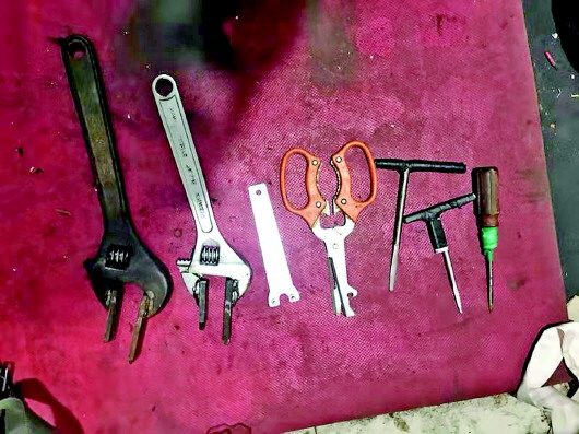 这间面积不大的小屋里,到处是跟电动车有关的电瓶、充电器、车座等,此外还有切割机、自喷漆、T型改锥、活口扳等盗窃用品一宗。