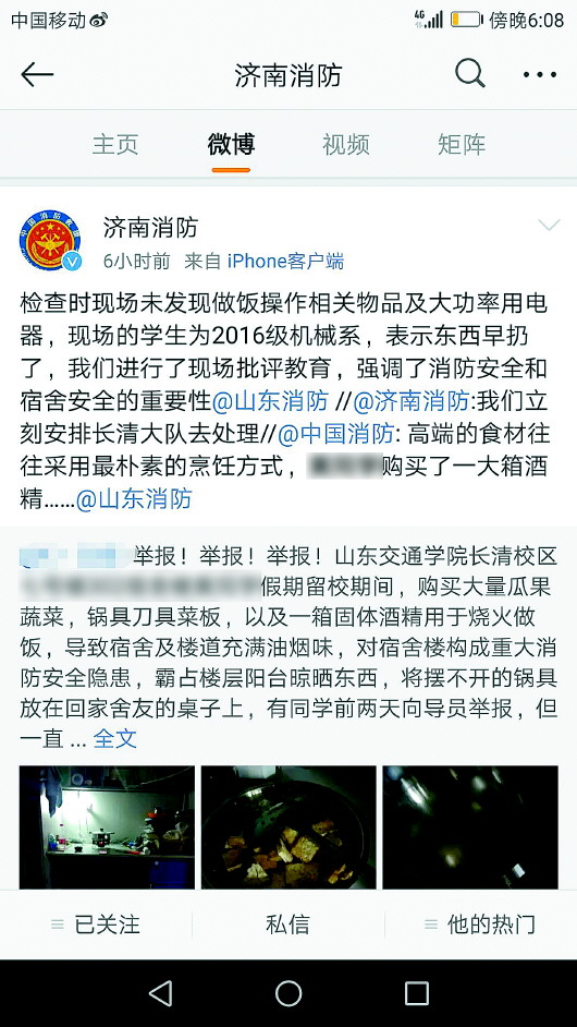 “举报!举报!举报!山东交通学院长清校区有同学假期留校期间,购买了大量瓜果蔬菜、锅具刀具菜板,以及一箱固体酒精用于烧火做饭。”14日,一位网友在微博上举报山东交通学院有人在宿舍生火做饭,引起@中国消防关注,最终济南消防赶到现场进行了调查。
