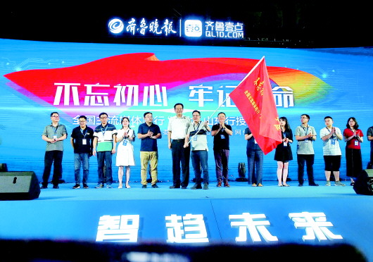 在7月23日下午的全国主流媒体践行“四力”山东行暨“智趋未来”齐鲁晚报·齐鲁壹点智媒矩阵战略发布会现场,全国主流媒体践行“四力”山东行活动正式启动。山东省委宣传部副部长、省广播电视局局长李昌文向采访团代表、羊城晚报编委兼区域新闻全媒体编辑部主任马勇授旗,齐鲁晚报等媒体代表一并上台接旗。