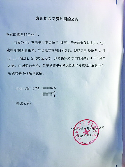 “合同交房日期是今年3月底,可是现在马上7月底了开发商迟迟没有交房。有等孩子9月份开学的,有等交房装修结婚的,真是让人心焦。”章丘盛世锦园一位业主向记者诉苦。