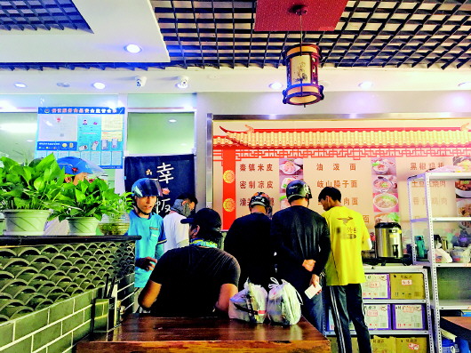 在济南一家餐饮店内,外卖小哥们等待取餐。 齐鲁晚报·齐鲁壹点记者 于民星 摄