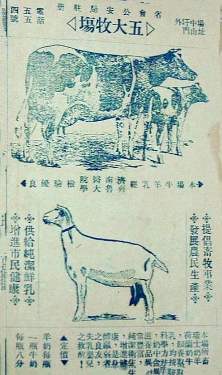 “五大牧场”成立之初,主要是产销羊奶。羊奶最初是用汽水瓶灌装,分为整瓶与半瓶两种规格,整瓶售价一角,半瓶售价五分。后来,汽水瓶换成了从上海购入的美制玻璃奶瓶,大瓶容量十英两,小瓶容量四英两。瓶装的羊奶,由员工背着褡子送到用户家中。
