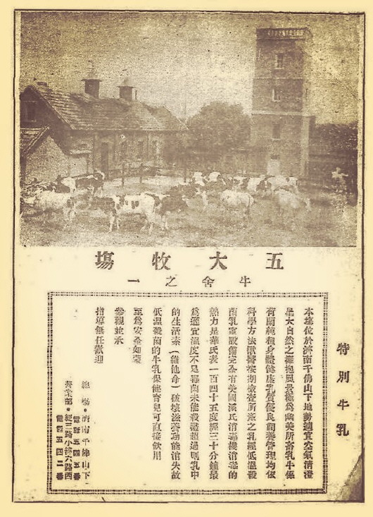 昔日“五大牧场”的旧址在南圩子中山门外,也就是今日文化西路东首路南。1934年出版的《济南大观》是这样记载的:五大牧场在中山圩门外,电话五五四。新建房舍规模较大,设备完善。内畜纯种瑞士乳羊一百七十余只、纯种荷兰乳牛十余头,至饲养、取乳均能注意消毒,慎重卫生,并聘有专门兽医担任注射防疫检查,牛、羊及其乳汁等项工作营业方面颇称发达。该场除牛、羊乳外,并出售德国纯种狼犬。该场为扩充营业起见,牛、羊奶较他场为廉,牛乳每瓶八分,羊乳每瓶一角。