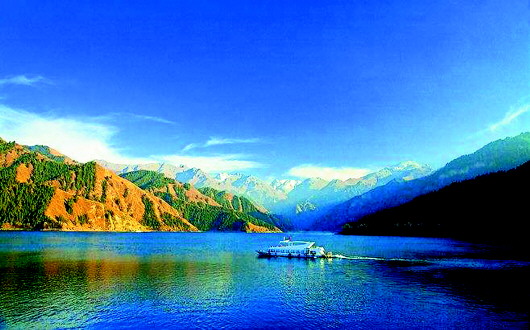 天山天池风景区距乌鲁木齐110公里,天池位于该风景区的中北部,传说这里曾是王母娘娘的沐浴池。天池海拔在980米左右,长约3.4公里,最宽处为1.5公里,最深处达105米。湖水清澈碧透,周围云杉茂密,背后是白雪皑皑的博格达峰,湖光山色构成了天池迷人的高山景色。盛夏时分,天池附近却很凉爽,是避暑佳地。