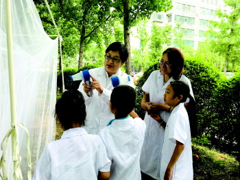 双层叠帐法是监测蚊虫密度的一项基本操作,杨琳琳和同事王燕、马希鹏等一起,协助孩子们搭好了蚊帐。“这位叔叔要站到蚊帐最里面当诱饵,蚊子会被人呼出的二氧化碳引来,因为有双层叠帐,所以叮不到里面的人。这是一个捕蚊器,我们站在外层的蚊帐间隙里等着,看到有蚊子‘上钩’咱们就把口对准,蚊子就吸进来了。”杨琳琳手把手教着孩子们专业仪器的使用方法,大家都跃跃欲试。