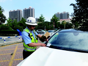 交警正对违停车辆开具违停单据。 本报记者 邓超 摄