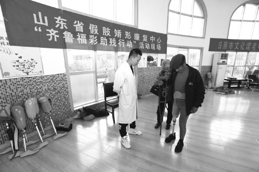 2018年11月,在日照市社会福利中心,60多岁的周京权换上了由省假肢矫形康复中心制作的假肢,在老伴的搀扶下,周京权小心翼翼地适应着用假肢行走。“经过短期适应训练,很快周大爷就能摆脱拐杖,独立行走了。”假肢制作技师说。