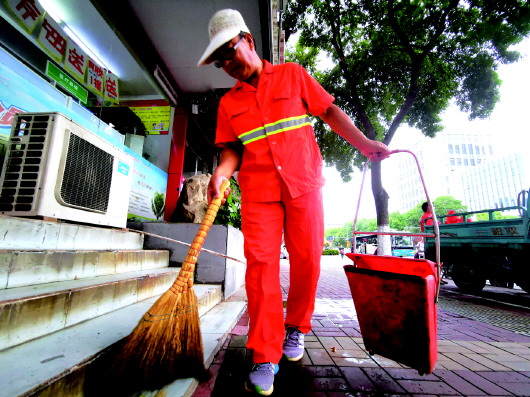 照片里的环卫工就是夏均文。如今两年已经过去,他仍在大街小巷中来回穿梭,不惧高温“烤”验,为城市的美丽保驾护航。