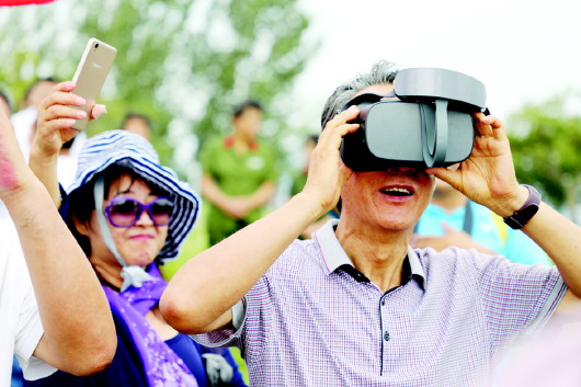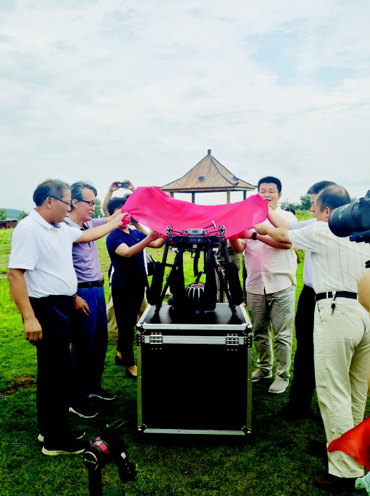 领导嘉宾为本次VR航拍活动所用的无人机器材掀起“红盖头” 王逸涵 摄