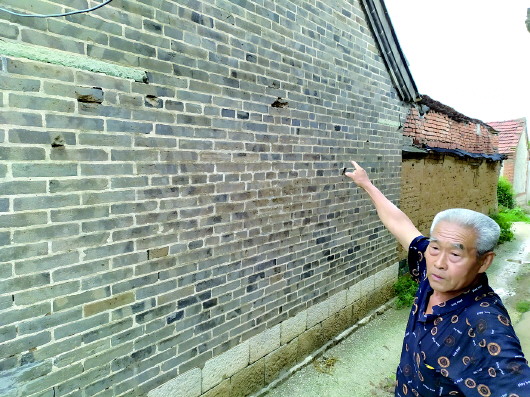 今年74岁的张田是将军顶村的村民,从小听着将军顶阻击战的故事长大,战役打得很激烈。他带着记者来到一处已有百年历史的老房子面前,老房的外墙上至今仍然有当年留下的弹痕。“飞机从西南方向飞过来,轰炸时,弹片四散,房子上就留下了这些弹痕。”