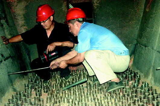 检修人员冒着近40摄氏度高温更换除渣刮板。