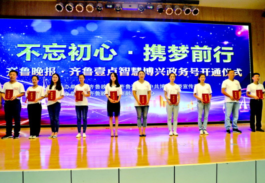 9日,齐鲁晚报·齐鲁壹点智慧博兴政务号开通仪式在博兴县第二中学礼堂举行。图为获奖的10名博兴首批优秀通讯员。