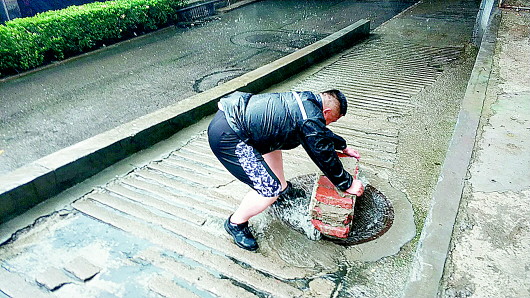 生产路铁路桥西辅道井盖冒溢,北坦街道办工作人员发现后立刻处理,将井盖压实。 街道办供图