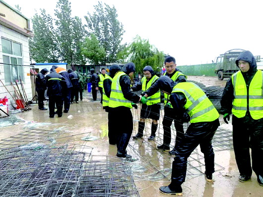 指挥部门前,来自寿光城投集团的98名抢险人员冒着雨,紧锣密鼓地扎制钢筋笼。“这些都是我们的管理人员,也都是施工技术员出身,从早上六点就一直在这里扎钢筋笼,提供给抢险一线。”寿光城投总经理助理王健告诉记者,他们集团旗下的多家公司都安排了人员参与抢险,还有人员正在陆续赶来。