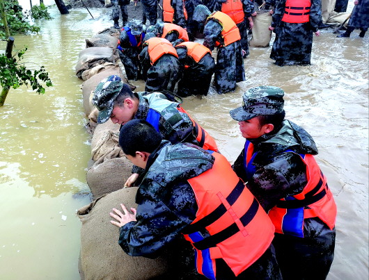 寿光弥河营里镇段,参加救援的战士正在用沙袋阻挡水流。 齐鲁晚报·齐鲁壹点记者 周青先 实习生 杨桐 摄