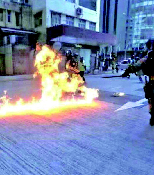 11日晚,暴徒在多处向香港警察投掷汽油弹,一名警员严重烧伤。当日,在香港警方发出反对通知书的情况下,仍有示威者到香港多个地区游行。其中,暴徒在长沙湾警署、尖沙咀警署、湾仔警察总部等地向警务人员投掷汽油弹,并用强光照射警务人员。一名警员在尖沙咀警署内执勤时被暴徒投掷的汽油弹烧伤双腿,初步诊断左腿10%二级烧伤,右腿3%一级烧伤。