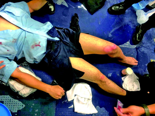 11日晚,长沙湾附近,一队正在执勤的警员也遭到汽油弹袭击,在对暴徒实施抓捕的过程中,一名警员受伤。