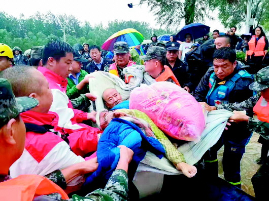 8月12日,在章丘区相公庄街办东皋西村救援现场,北陆某预备役高炮团官兵用棉被营救出一名失能老人。