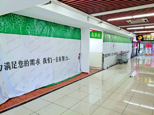根据商铺的指引,记者找到了儿童乐园的店址,店址已被清空,并围上了大幅的宣传喷绘。其中一幅喷绘上还挂着“旺铺招租”的广告,上面附有负责经理的联系方式,广告下面显示为该超市名字,疑似超市的运营方在招租。