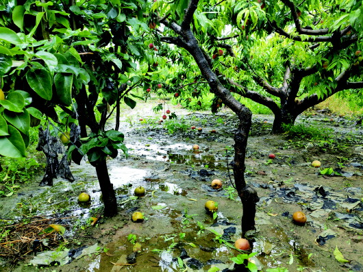 8月12日,在德州黄河涯镇万亩桃园,受到大风天气的影响,有不少成熟的桃子被吹落。