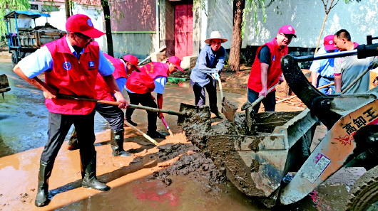 齐鲁志愿者帮受灾村民清理淤泥,重建家园。