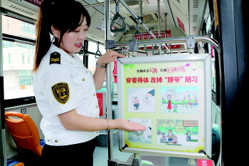 8月14日,交运温馨巴士767路、776路、774路等多条线路的公交车上多了“穿着得体改‘膀爷’陋习”漫画,引导市民摒弃不雅行为。据悉,交运温馨巴士4000余部公交车加入到拒绝“膀爷”乘车的文明队伍,采用卡通漫画等形式向赤膊光膀、脱鞋晾脚、随意暴露等不文明行为说“不”。