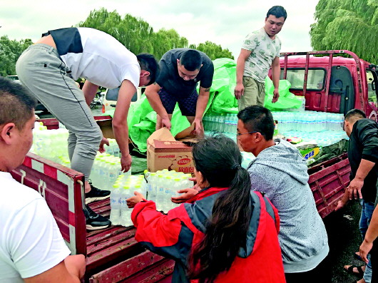 ▼爱心企业为受灾群众送来矿泉水。 齐鲁晚报·齐鲁壹点记者 石剑芳 摄