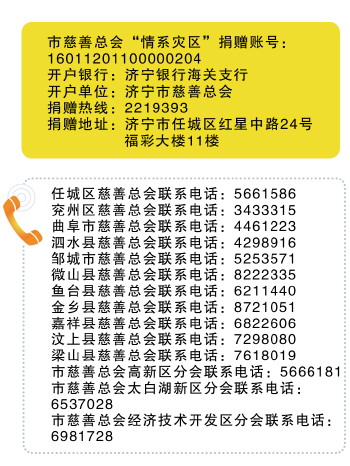 本报济宁8月15日讯(记者 晋森 通讯员 路笃书) 根据全省统一部署,8月15日,济宁市慈善总会发出通知,要求全市各级慈善总会组织积极行动起来,开展“情系灾区”募捐活动,面向社会公布“情系灾区”捐赠账号,广泛动员、积极接收社会各界捐赠。