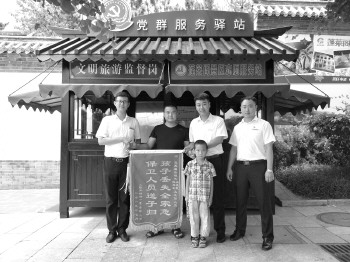 7月11日,驿站党员志愿者陈延彬和吴德民发现一名男孩与父亲走散,两人耐心地安抚受惊未定的男孩并帮助他找到父亲。男孩父亲当场要给陈延彬和吴德民现金表示感谢,但被婉言谢绝。为表达谢意,他又特地跑到蓬莱市区加急印制锦旗,亲自送到两人手中,并感激地说:“要不是他们的积极帮助和及时寻找,我还不能那么快和走失的孩子团聚。不愧为景区模范先锋队,为他们的行为点赞!”像这样的好人好事不胜枚举。党群服务驿站成为蓬莱阁景区最鲜艳、更耀眼的一面党旗。